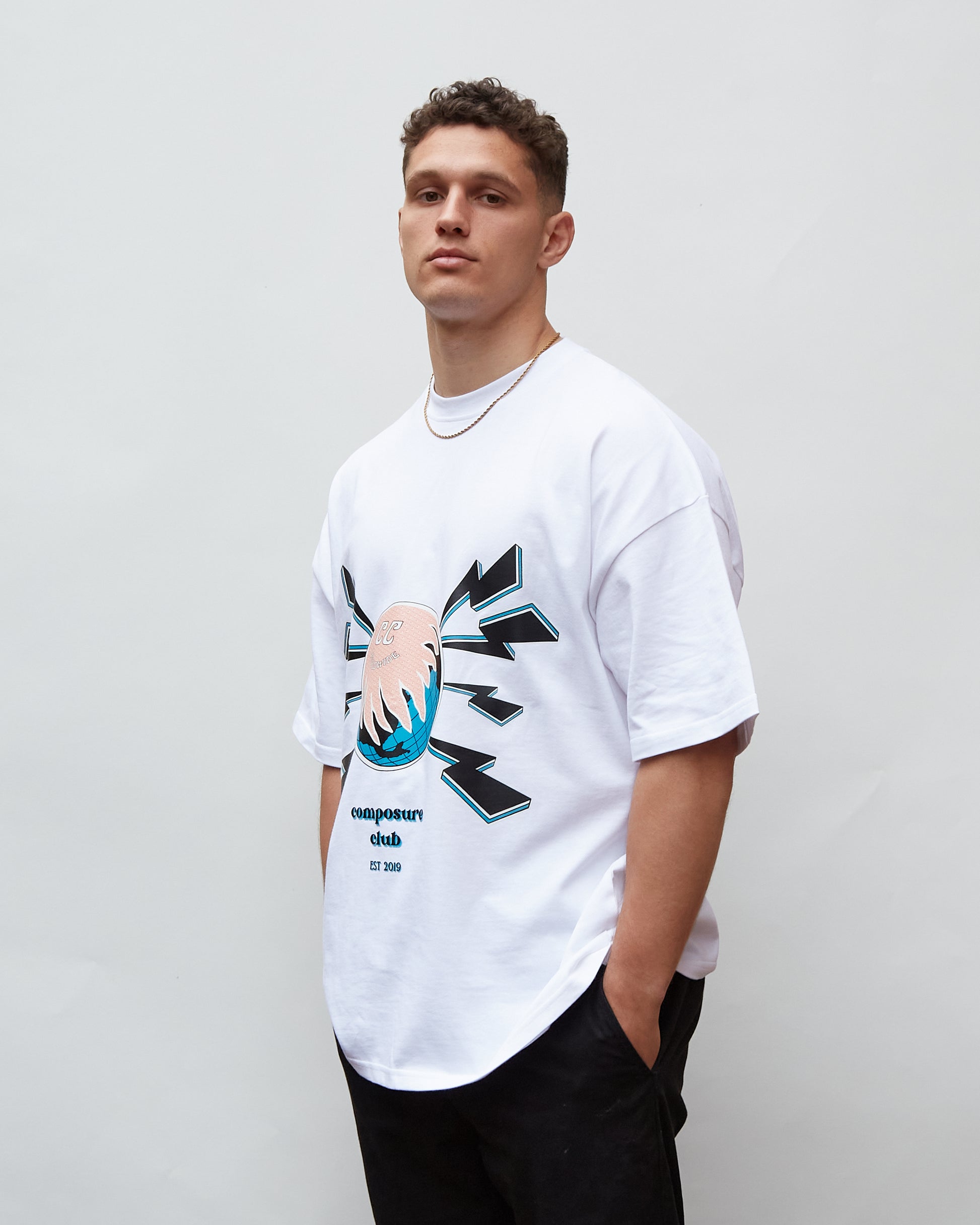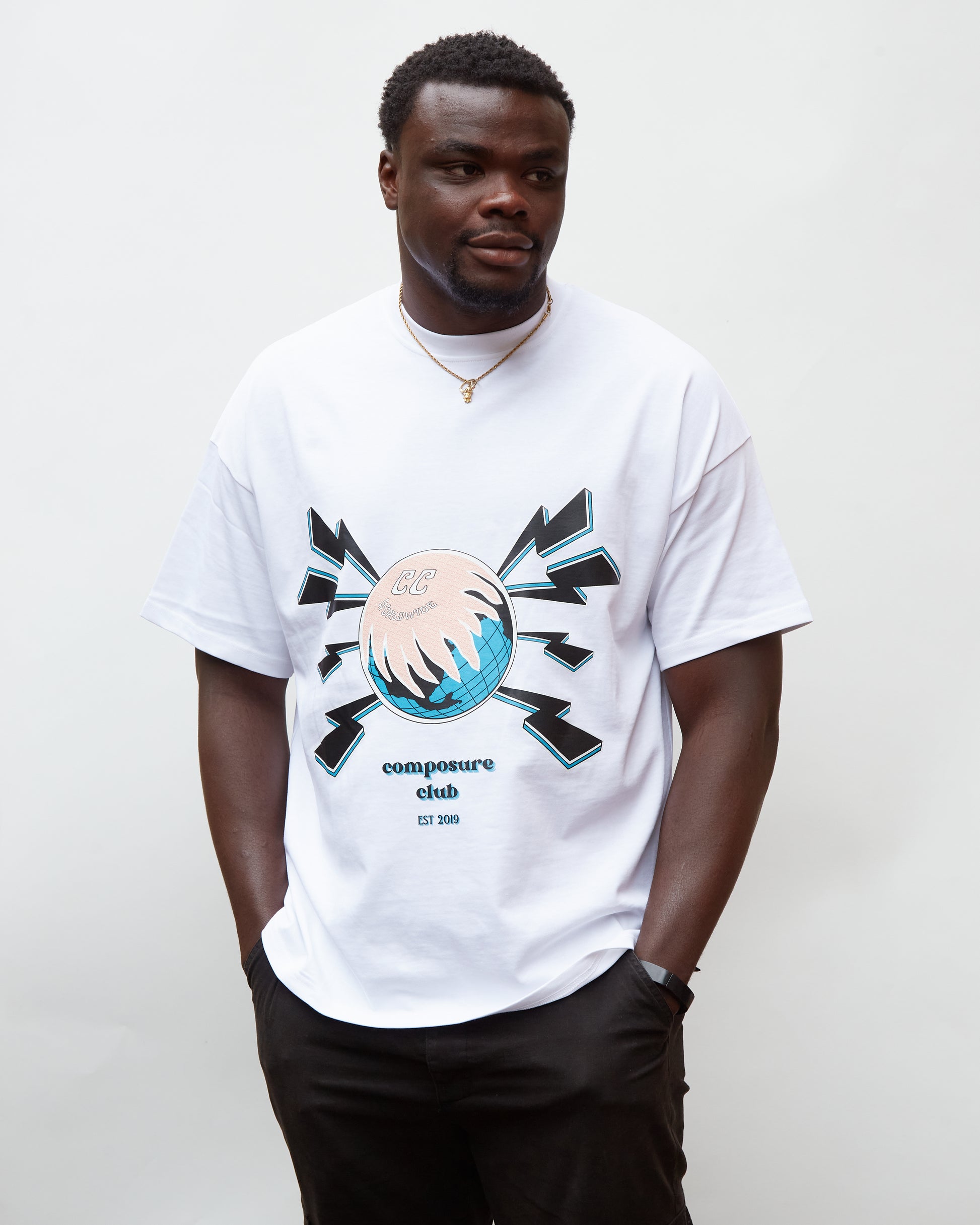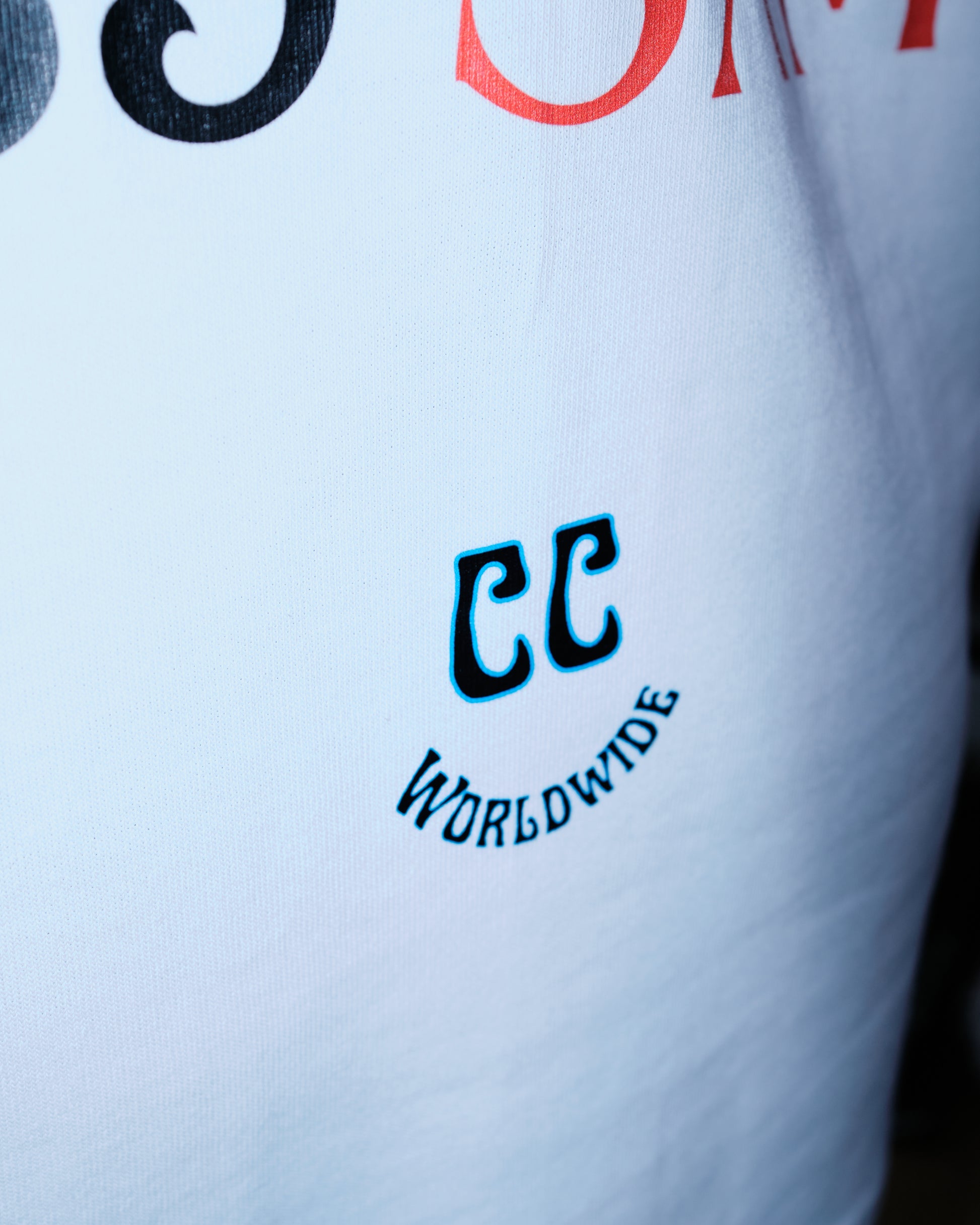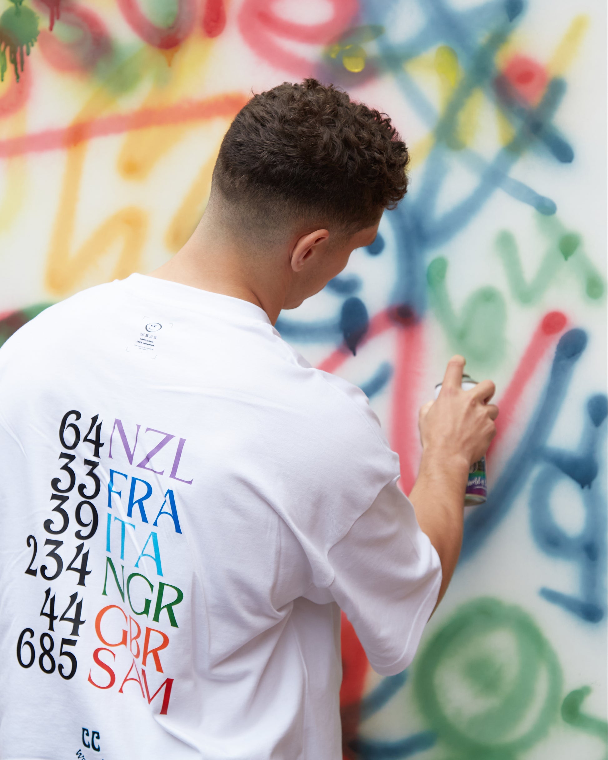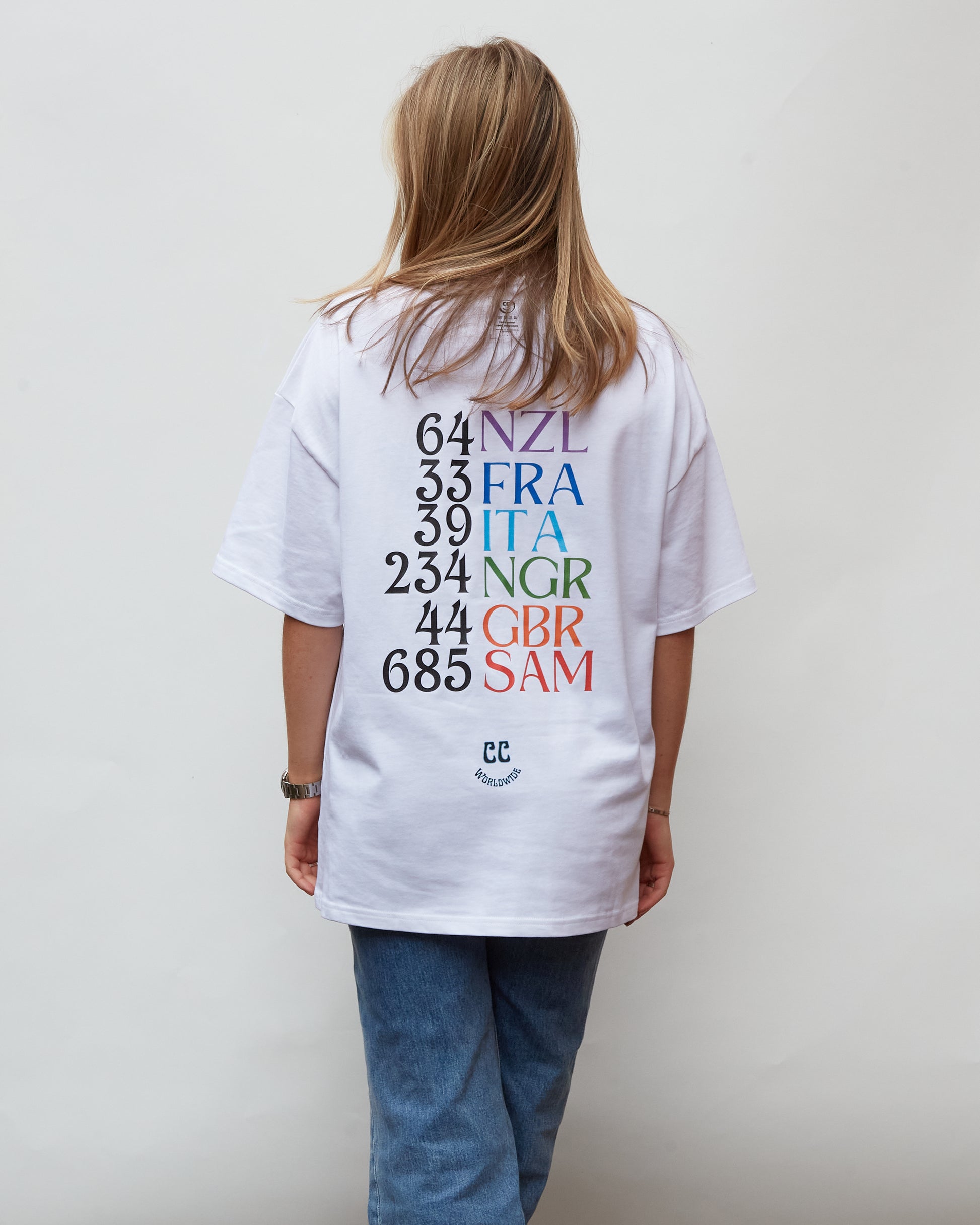 T-shirt bianca pesante 235GSM con logo mondiale rosa e blu / codici di chiamata nazionali stampati sul retro / colletto aderente / stampa DTG / vestibilità con spalla scesa / etichetta di cura stampata sul retro