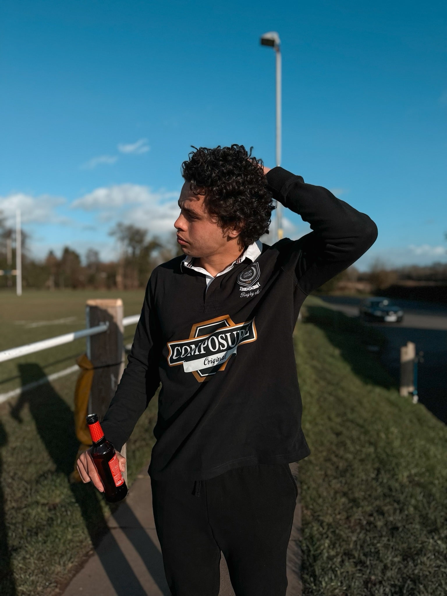 300GSM black heavyweight long sleeve polo rugby shirt with cc rugby club crest embroidered and cc original beer logo printed on the front / number 10 printed on back / more true to size fit - size up for an oversized look