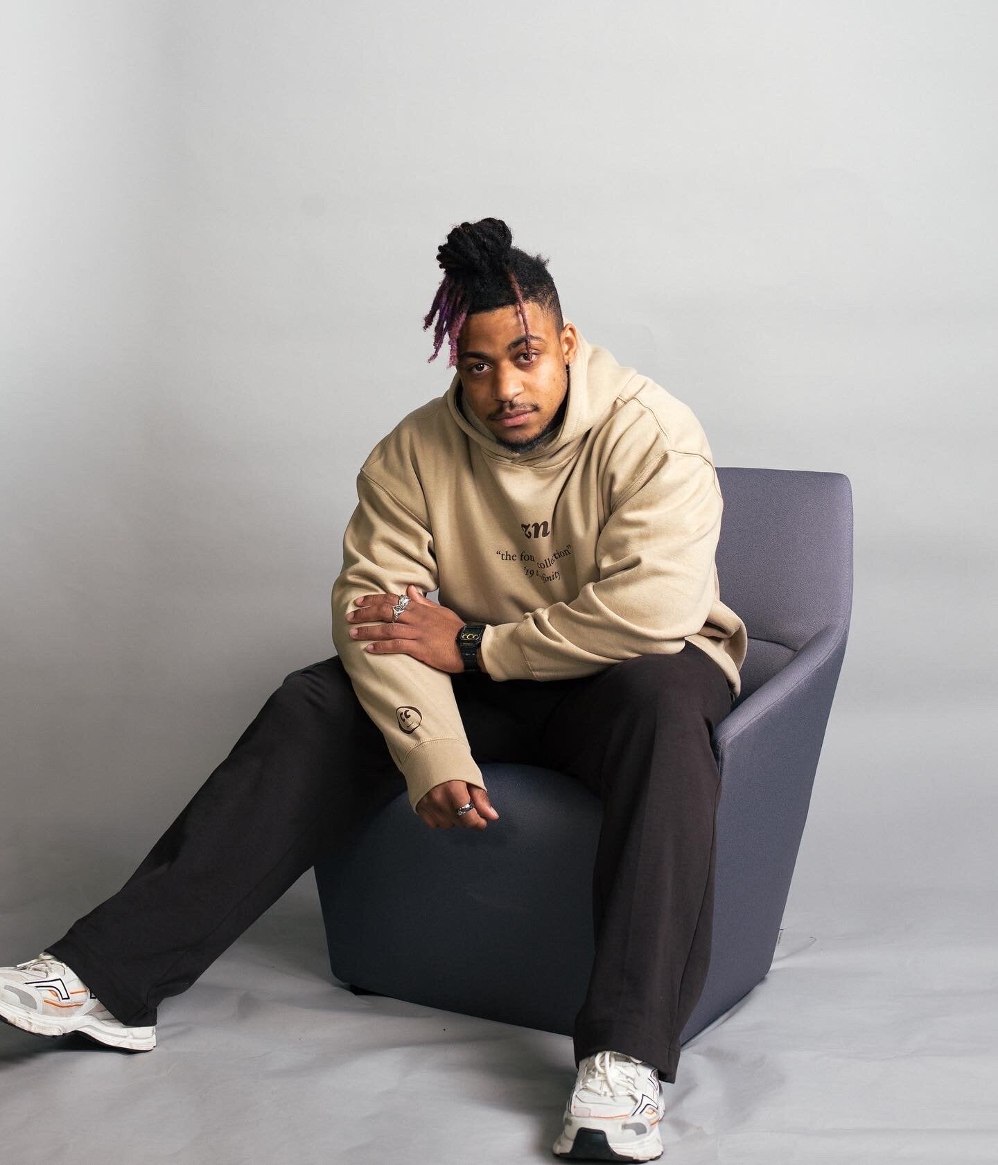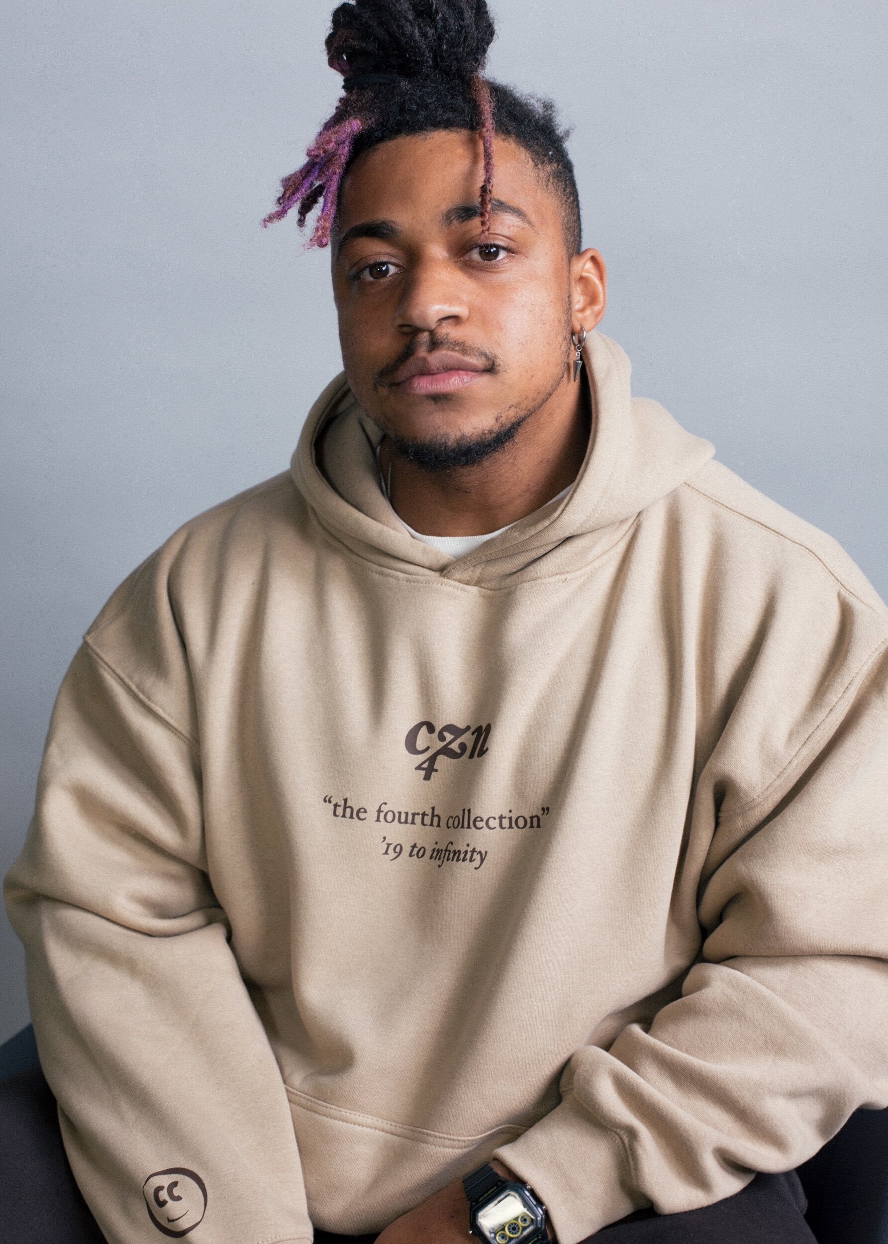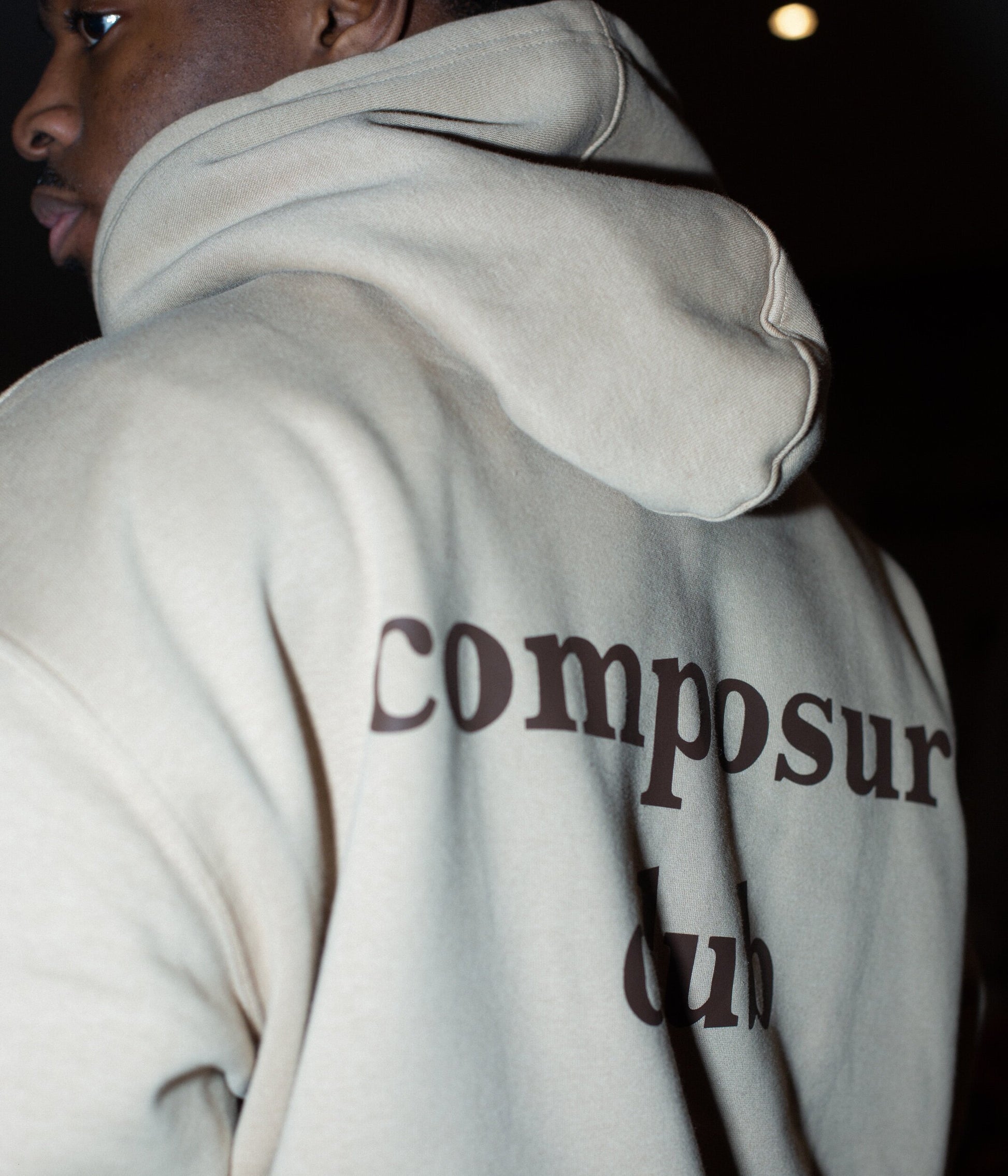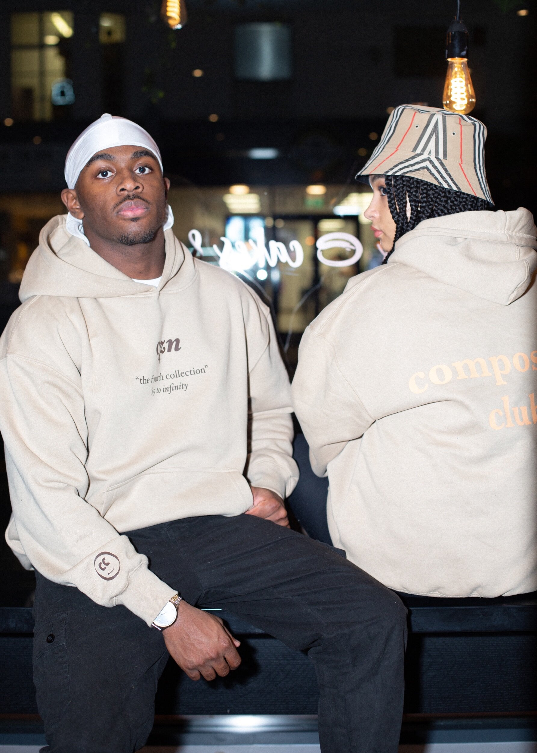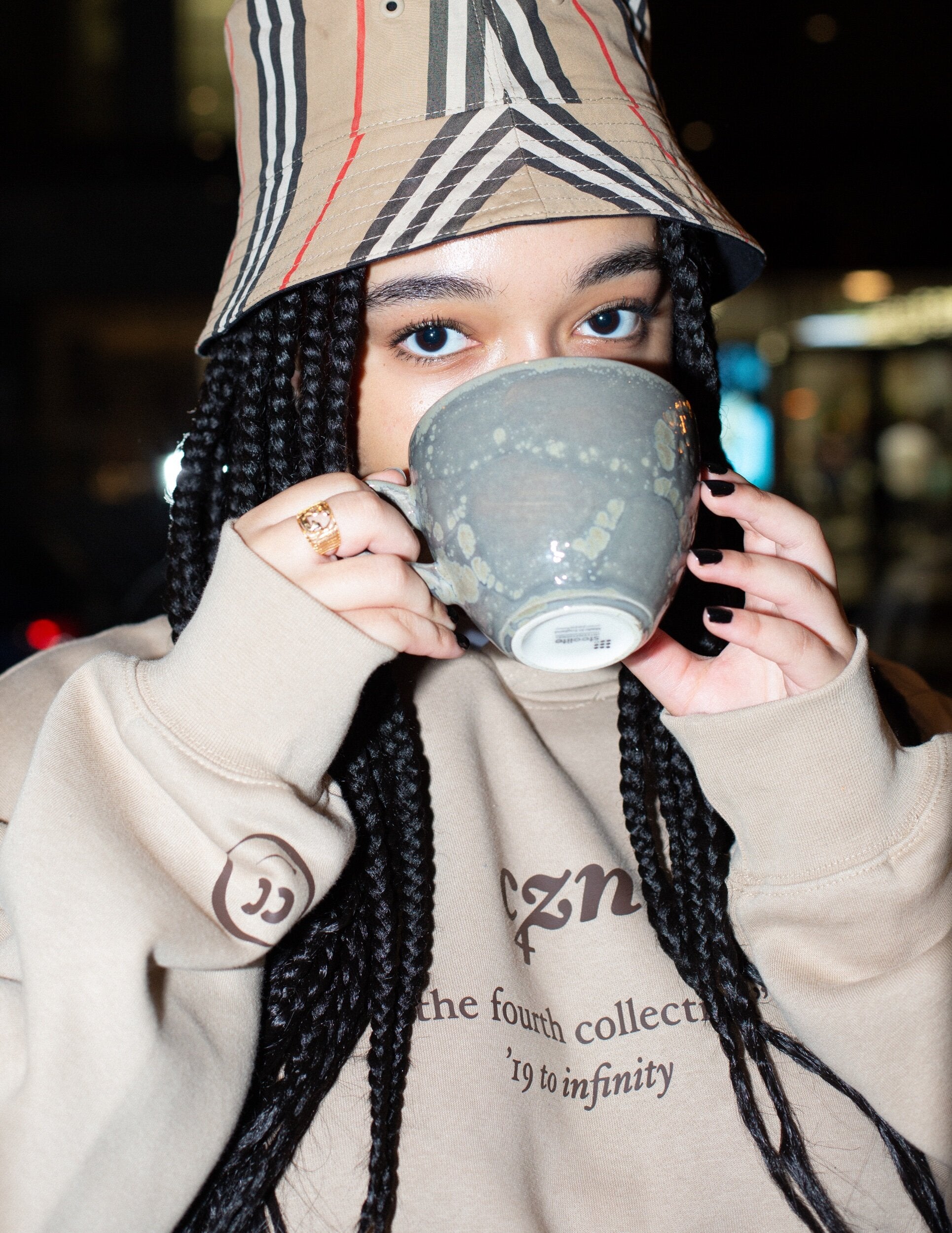 felpa con cappuccio beige con carattere marrone cioccolato ~ moka
