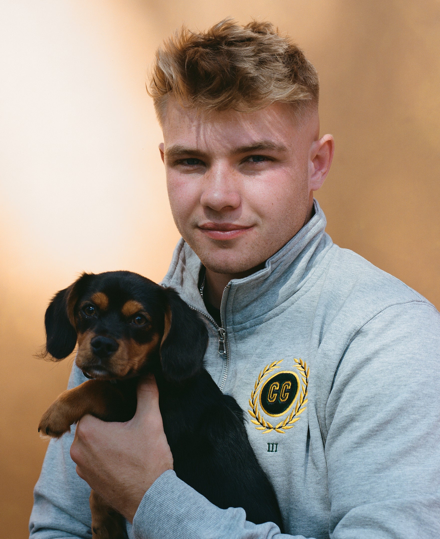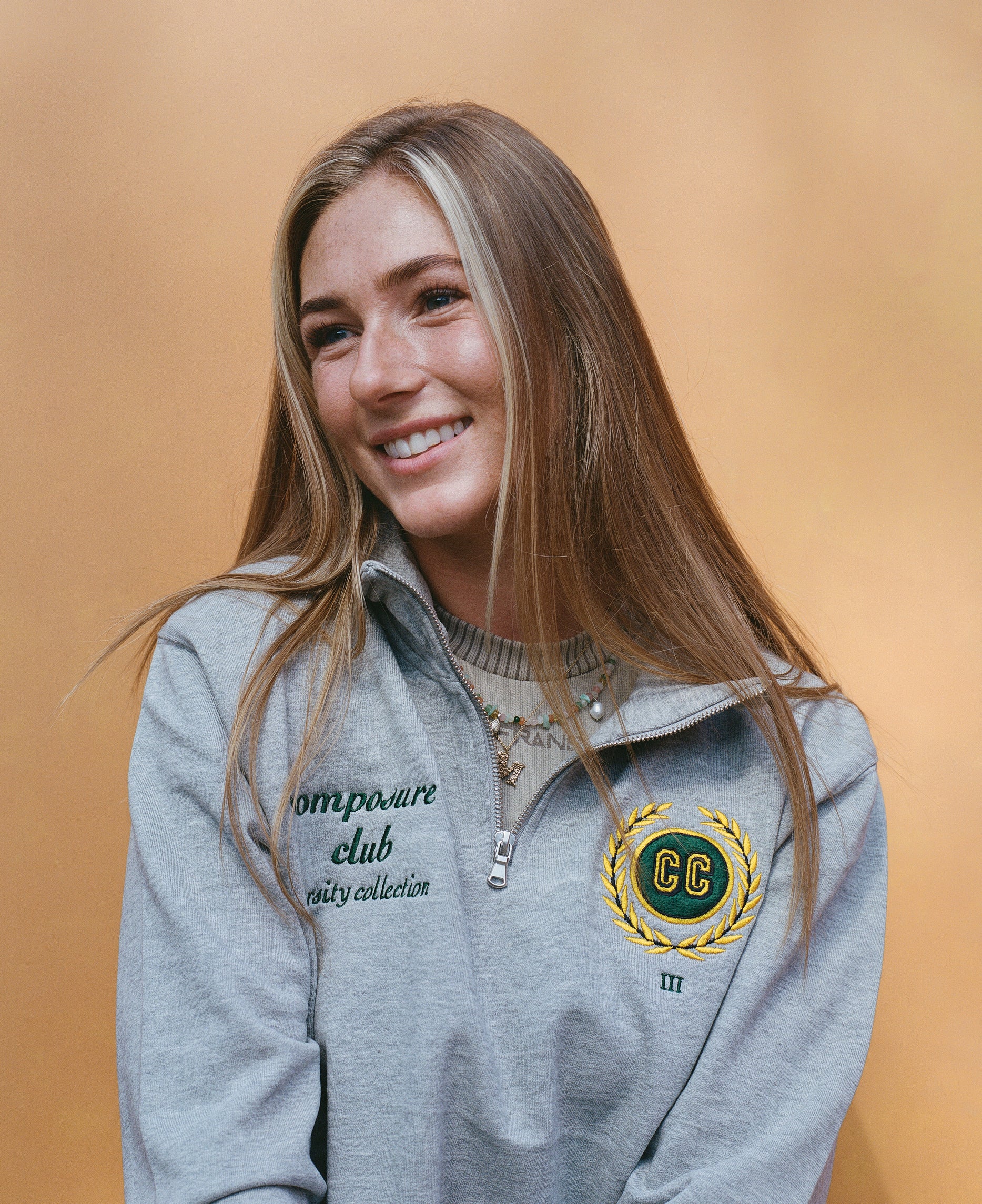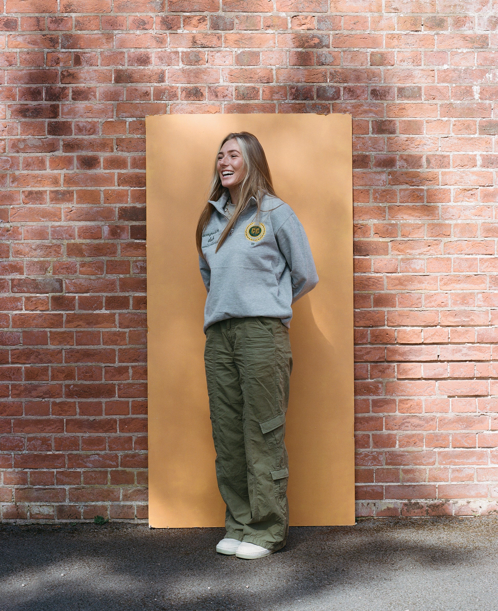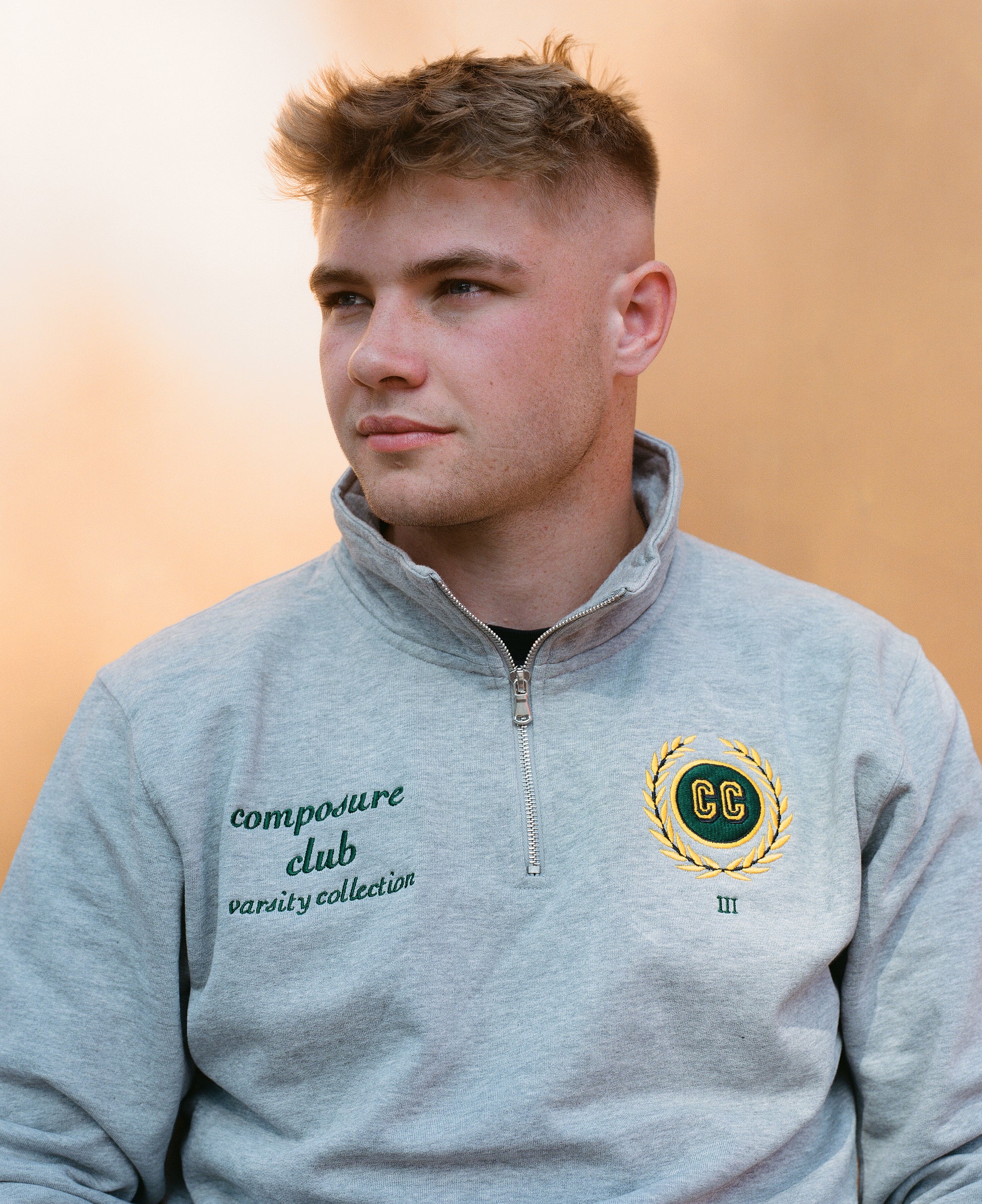 Maglia grigia con zip a un quarto, stemma CC ricamato, testo verde ricamato sul petto